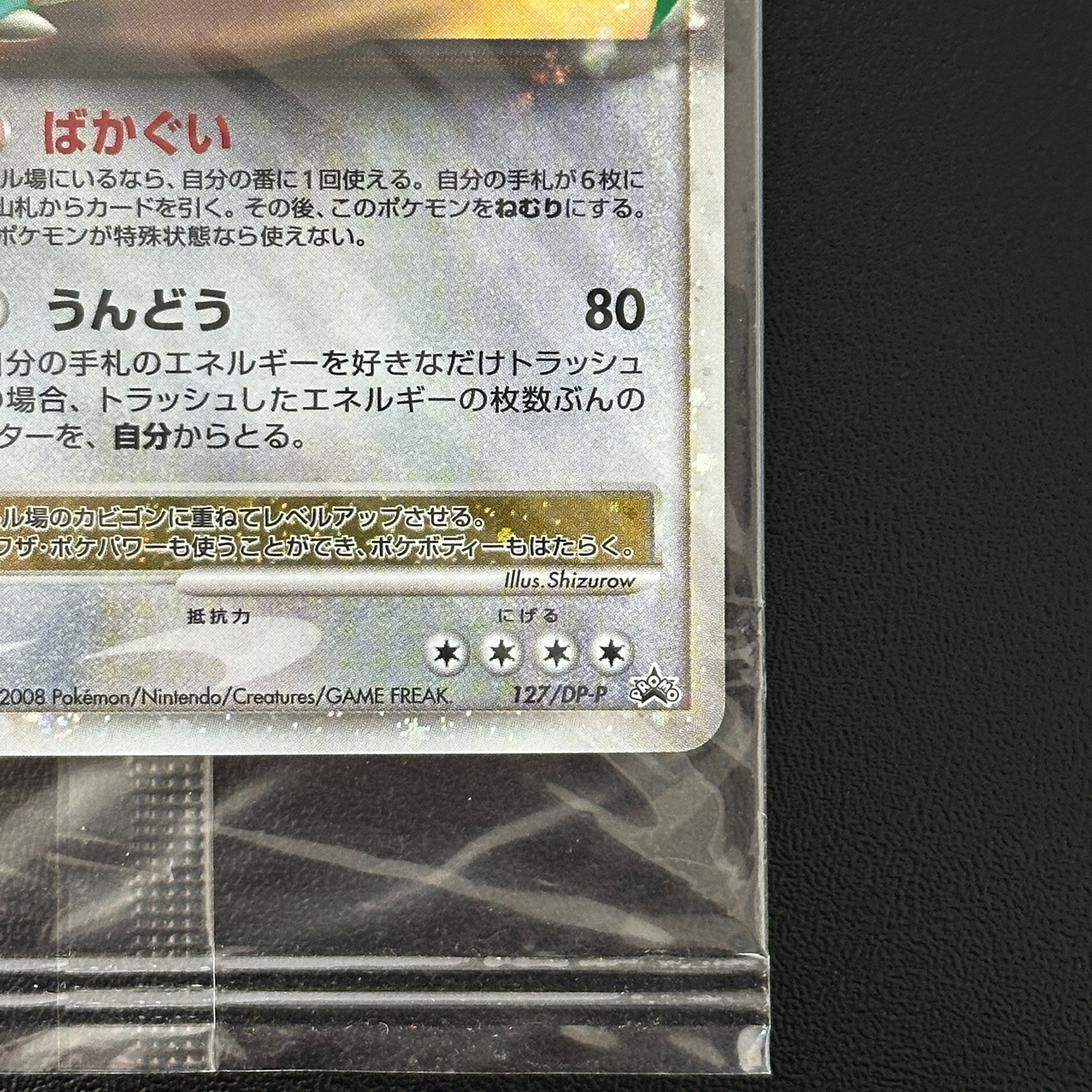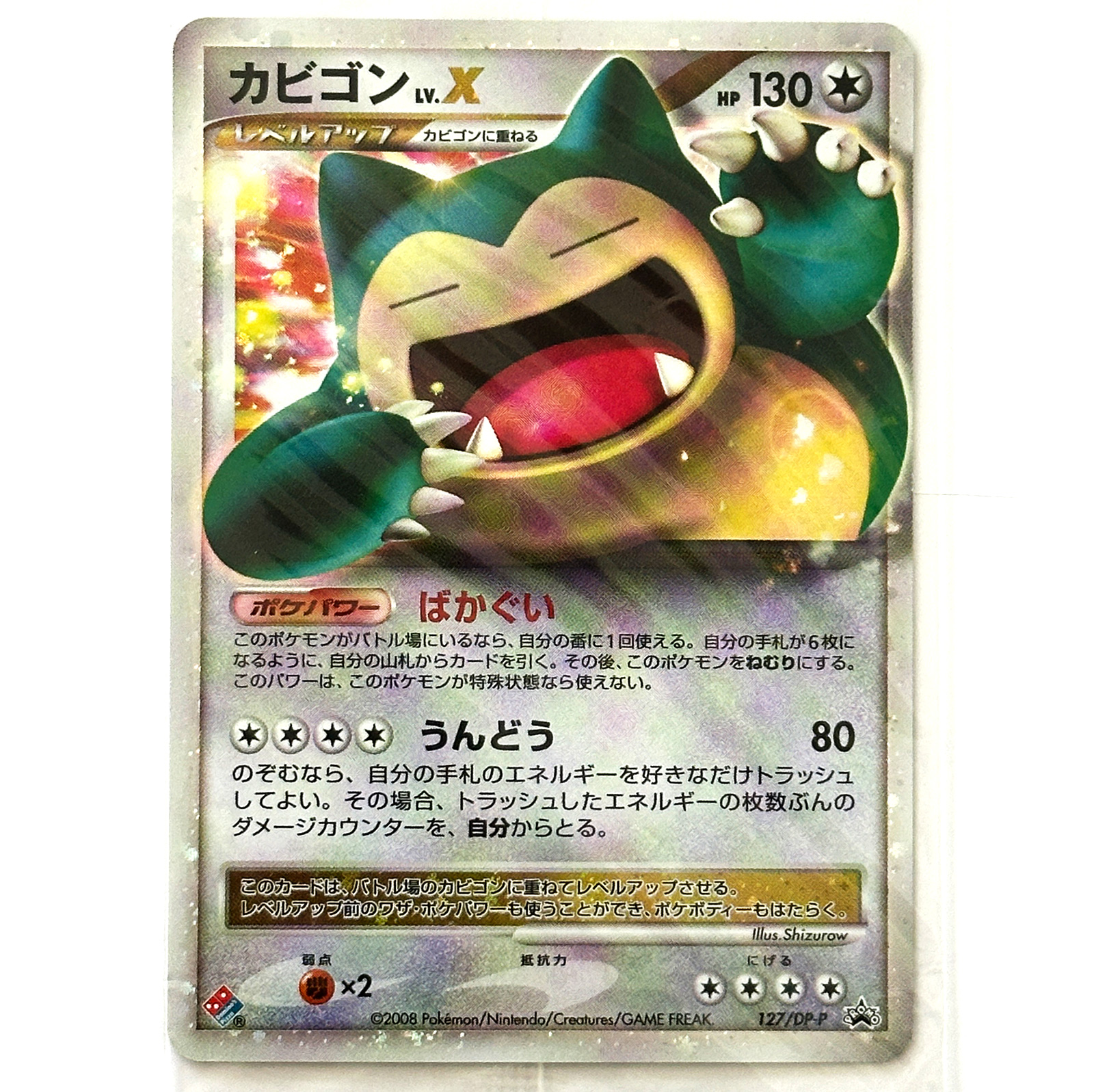 This promotional card features Snorlax LV.X with a beautiful holo finish and artwork by Shizurow. The card was released as part of the DP-P promotional series in Japan.